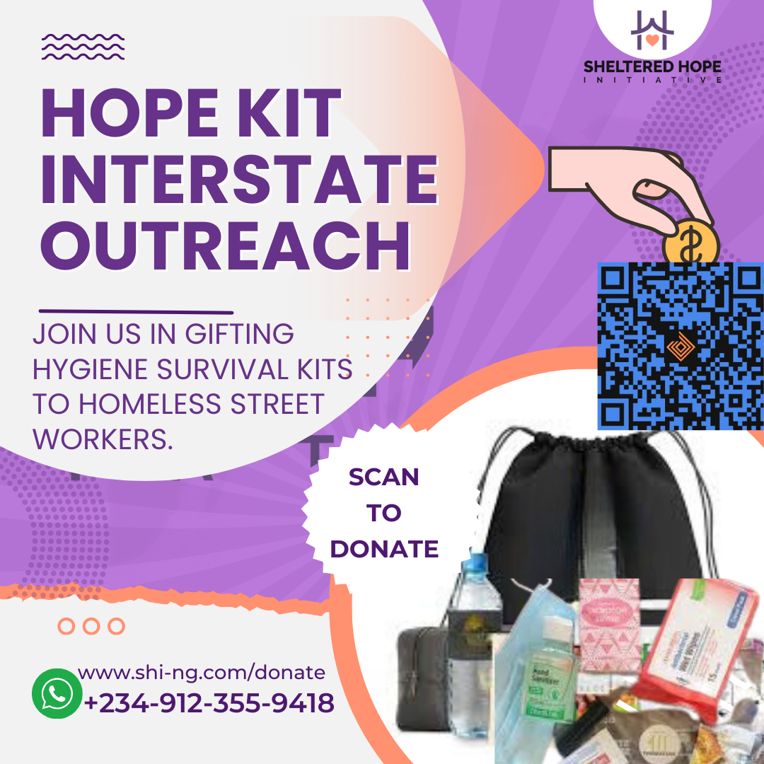 In honor of the World Suicide Prevention Day - Sept 10th, SHi organised an interstate mini outreach to the homeless street workers in Lagos, Abuja, Enugu and Ogun State, Nigeria. We distributed 20 hygiene survival kit items to 50 persons experiencing homelessness across these 4 states, kitting them with hope for survival on these cold and harsh streets.